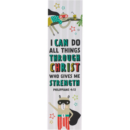 The bookmarks in the "I Can Do All Things Raccoon Superhero Sunday School/Teacher Bookmark Set" are a fun and colorful way to motivate young students to persevere through challenges.