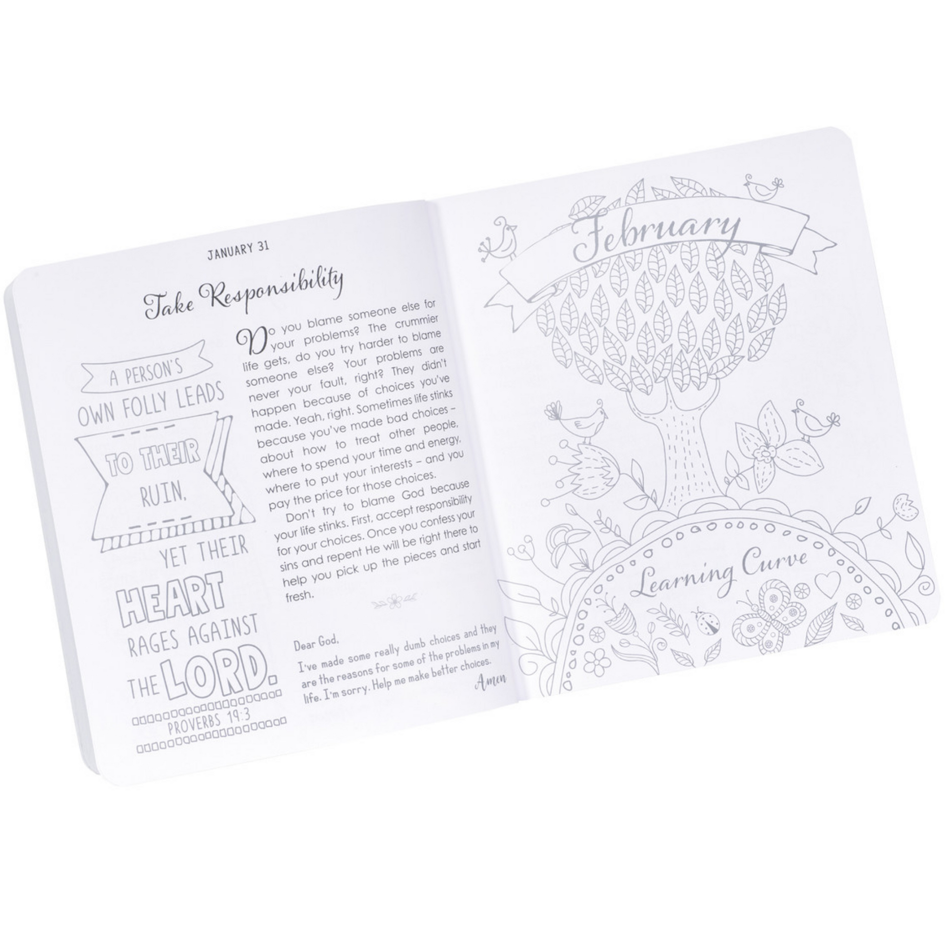 Each dated page features a pre-teen-worthy devotional and a line art illustration based on a Scripture verse to color, followed by a closing prayer prompt. Topics include our relationship with God and others, spiritual growth, Bible-based practical life tips, and more! The thickness of the bright white paper keeps the color from bleeding through.