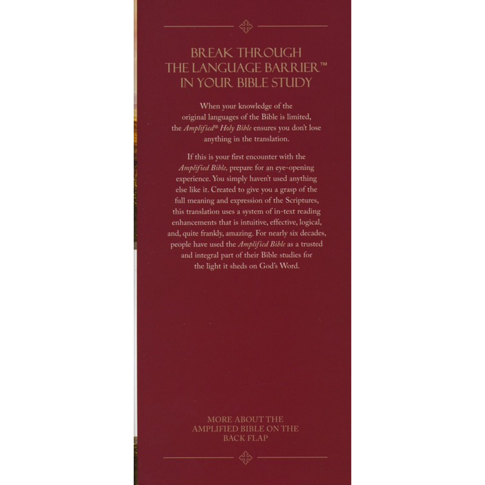 You’ve trusted the Amplified® Bible to deliver enhanced understanding of all the rich nuances and shades of meaning of the original Bible languages. For this kind of in-depth study, no working knowledge of Greek or Hebrew is required—just a desire to know more about what God says in his Word. Amplified Bibles use a unique system of punctuation, italics, references, and synonyms to unlock subtle shades of meaning as found in the original languages.