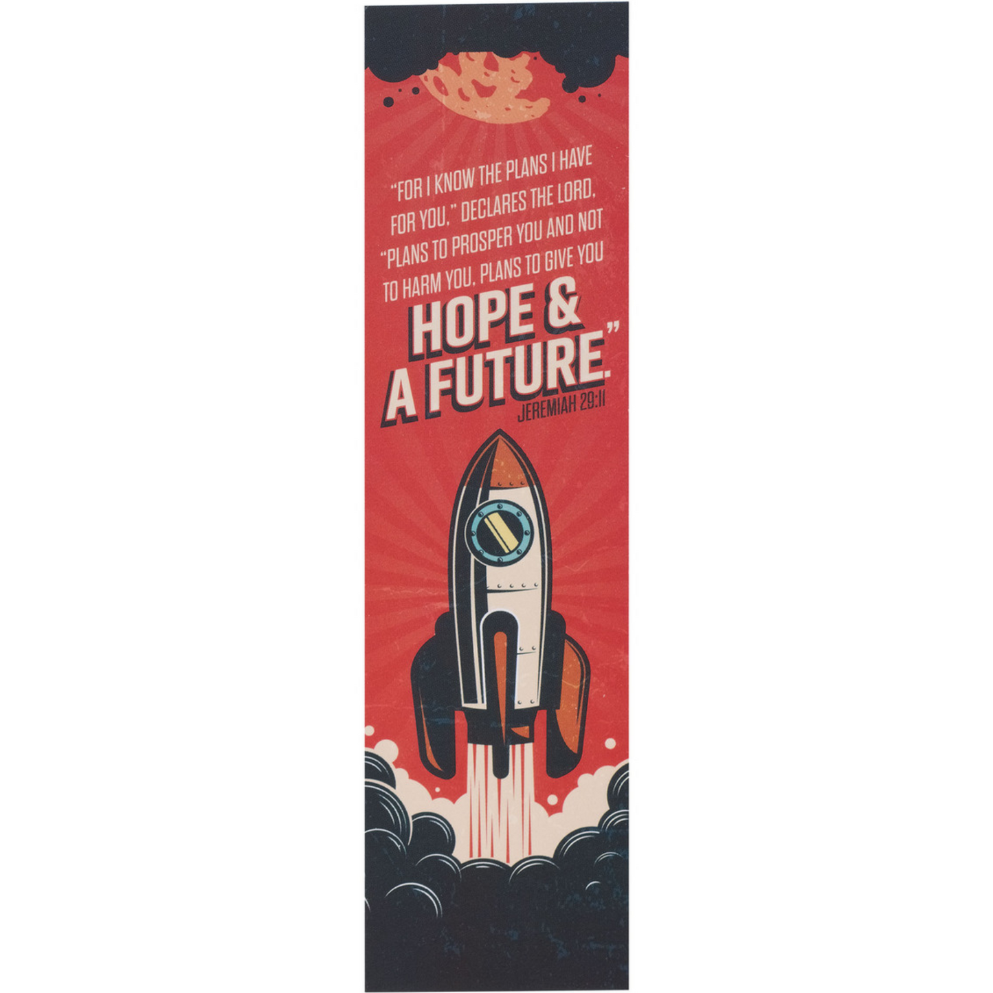 The bookmarks in the "I Know The Plans Red Rocket Sunday School/Teacher Bookmark Set" are an economical yet engaging gift to inspire elementary school boys in their faith journey.