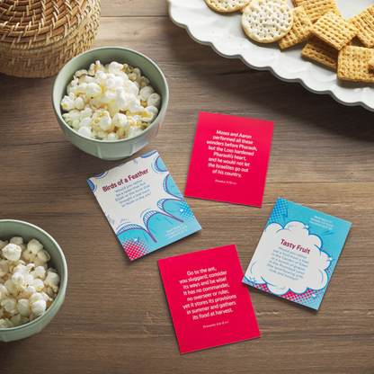This card set brings 44 fun, family-friendly conversation starters to the table! Each card kicks off with a unique, Bible-based question in a playful comic book design. Flip it over, and you'll find a Scripture verse on a solid color background to guide the conversation. The full-color cards are printed on glossy cardstock.